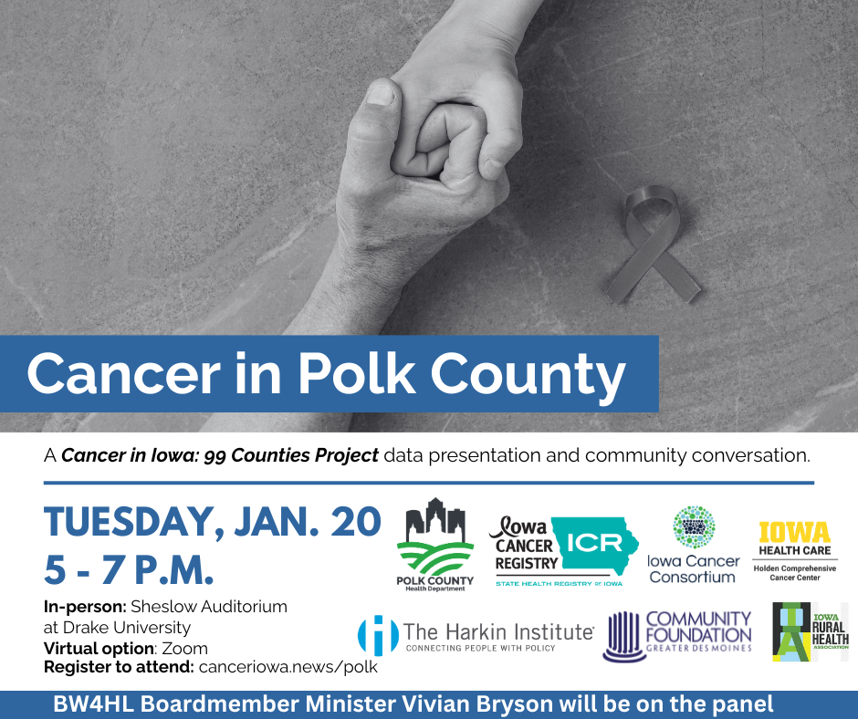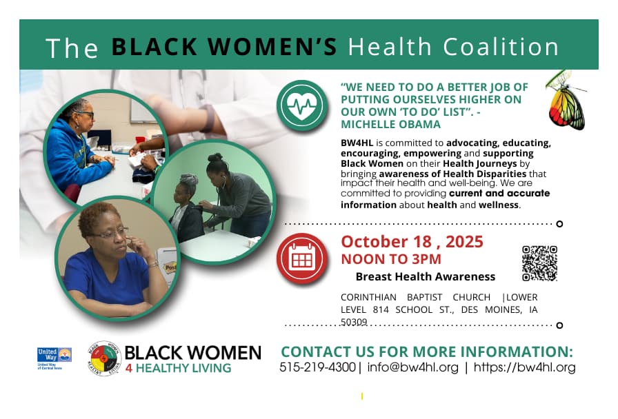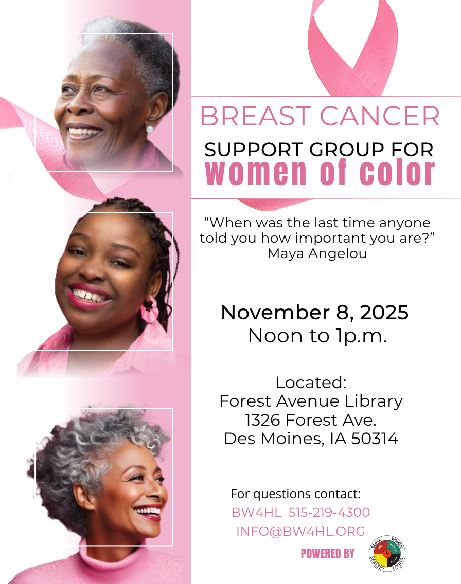- Our annual Breast Cancer Awareness walk is in October. We focus on the effects of breast cancer in Black women. We invite Dr. Susan Beck, who specializes in General Surgery at MercyOne Katzmann Breast Center, to educate us on breast cancer and how it affects Black women. We invite a local Black woman survivor to inform us and share her story, followed by a group walk of solidarity.
